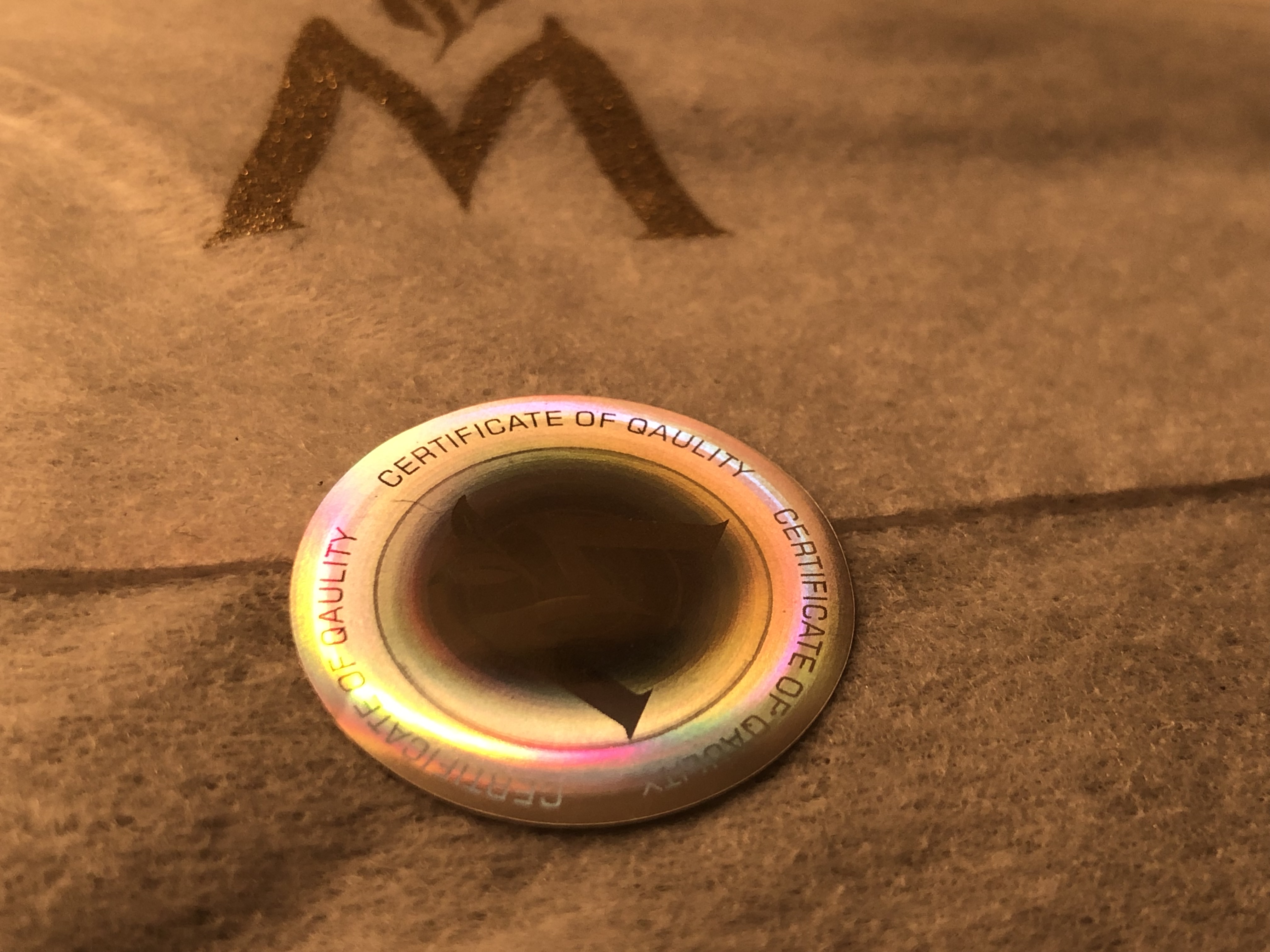 The seal of quality has a typo. Additionally, it's designed to leave a residue when you remove it, but this one was placed on a very soft surface, so it can easily be removed without incident.